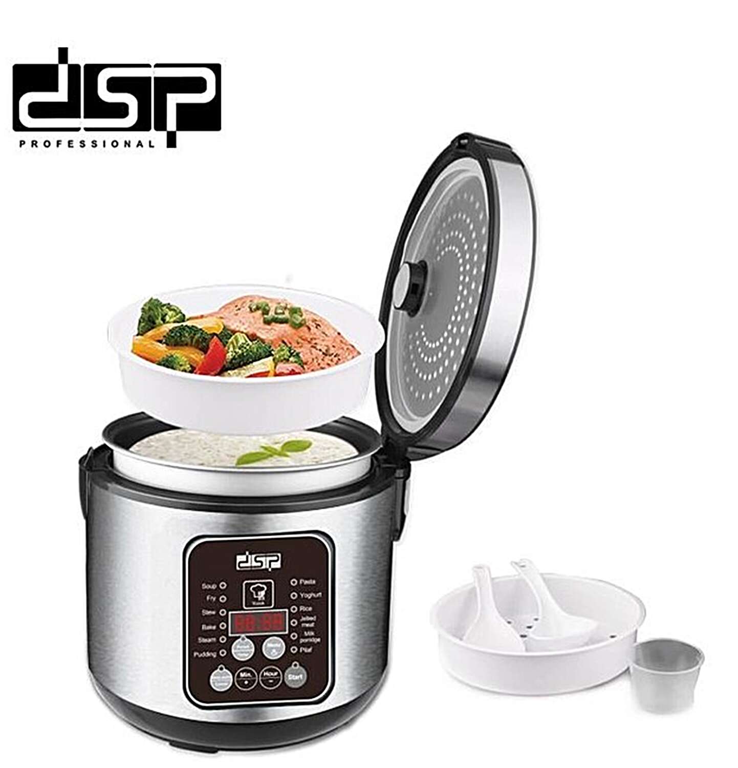 Мультиварка DSP KB-5004 самостійно приготує страву в певний час і підтримуватиме її в режимі підігріву. Досить просто покласти інгредієнти, вибрати програму, натиснути кнопку «Старт» і дочекатися приємного звукового сигналу, який сповіщає про приготування страви. Або встановити таймер відстрочки приготування і спокійно лягти спати.